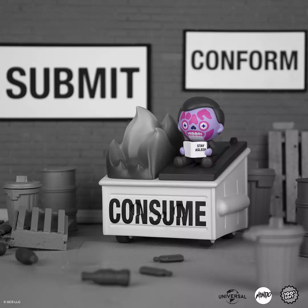 Inspired by one of our favorites films, THEY LIVE, we have teamed up with the awesome folks at 100% Soft and put a new (horrific) spin on their super popular Dumpster Fire Soft Vinyl toy. This one is ready to CONSUME, and is available during SDCC 2022.Â