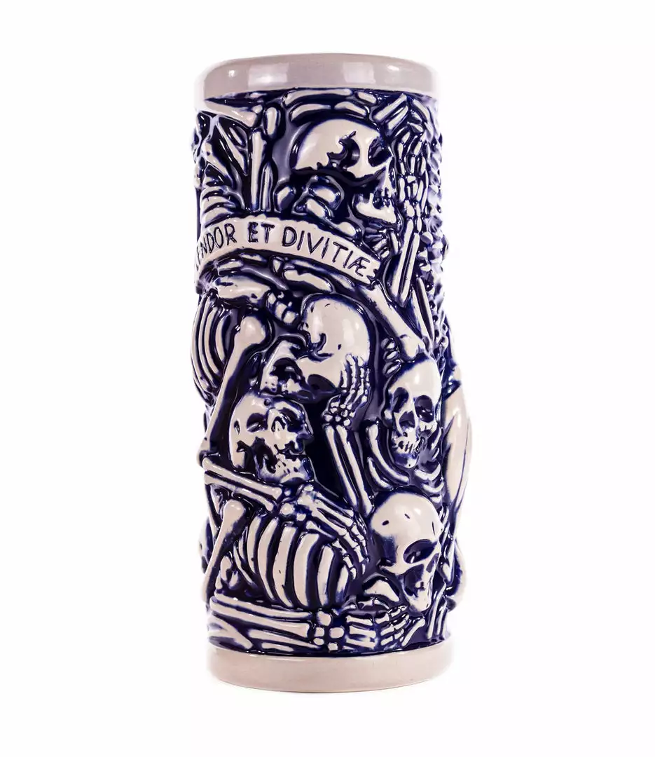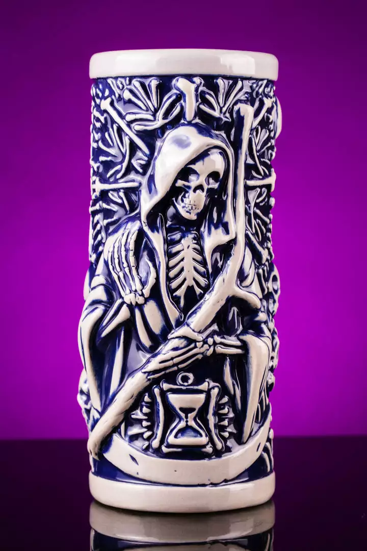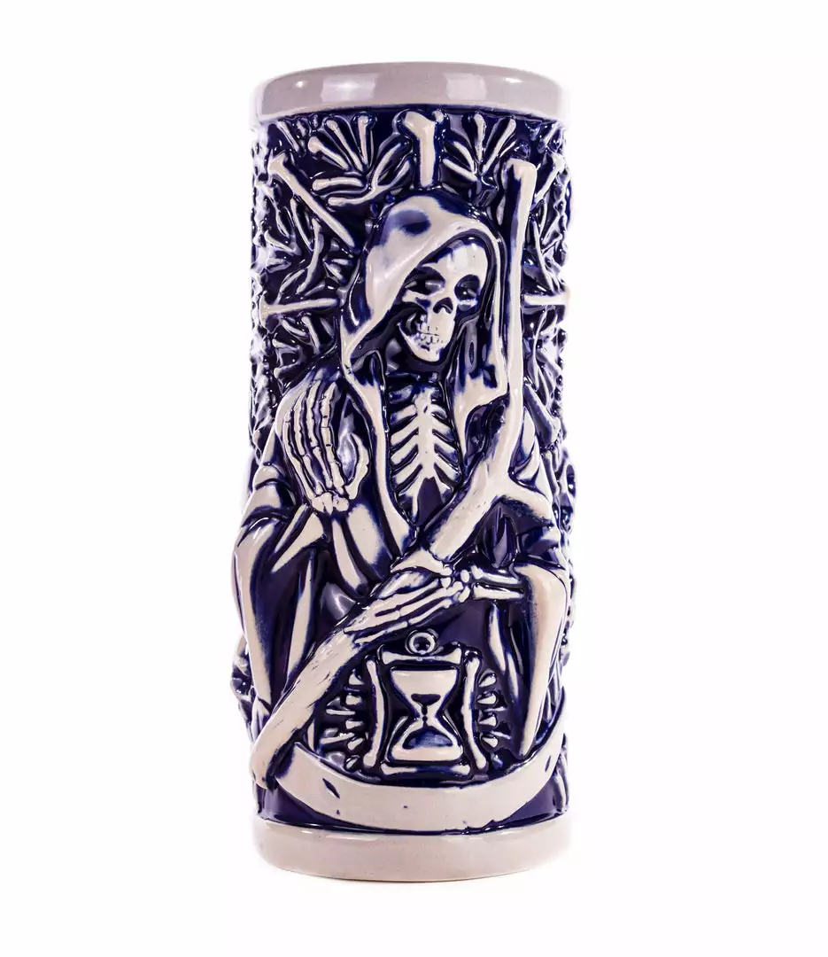 Continuing our Designer Series of tiki mugs, we asked artist Becky Cloonan to come up with a design, and our only request was “something with a Grim Reaper.” And she delivered- big time! Splendor & Riches Designer Series Tiki Mug- something like a cross between a Catholic candle and something from the Sediec Ossuary, is sculpted by Tufan Sezer & Mike Bonanno, and produced by our friends at Tiki Farm, stands approx. 7.” tall, and holds 22oz. The Mortuus version of Splendor and Riches features a white glaze base, with a blue wipe.