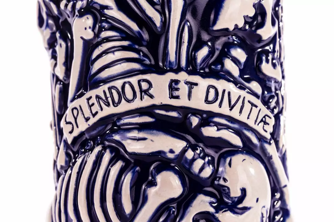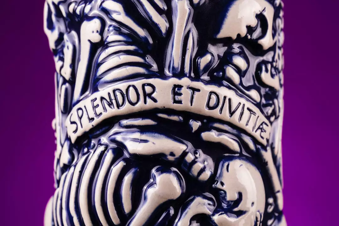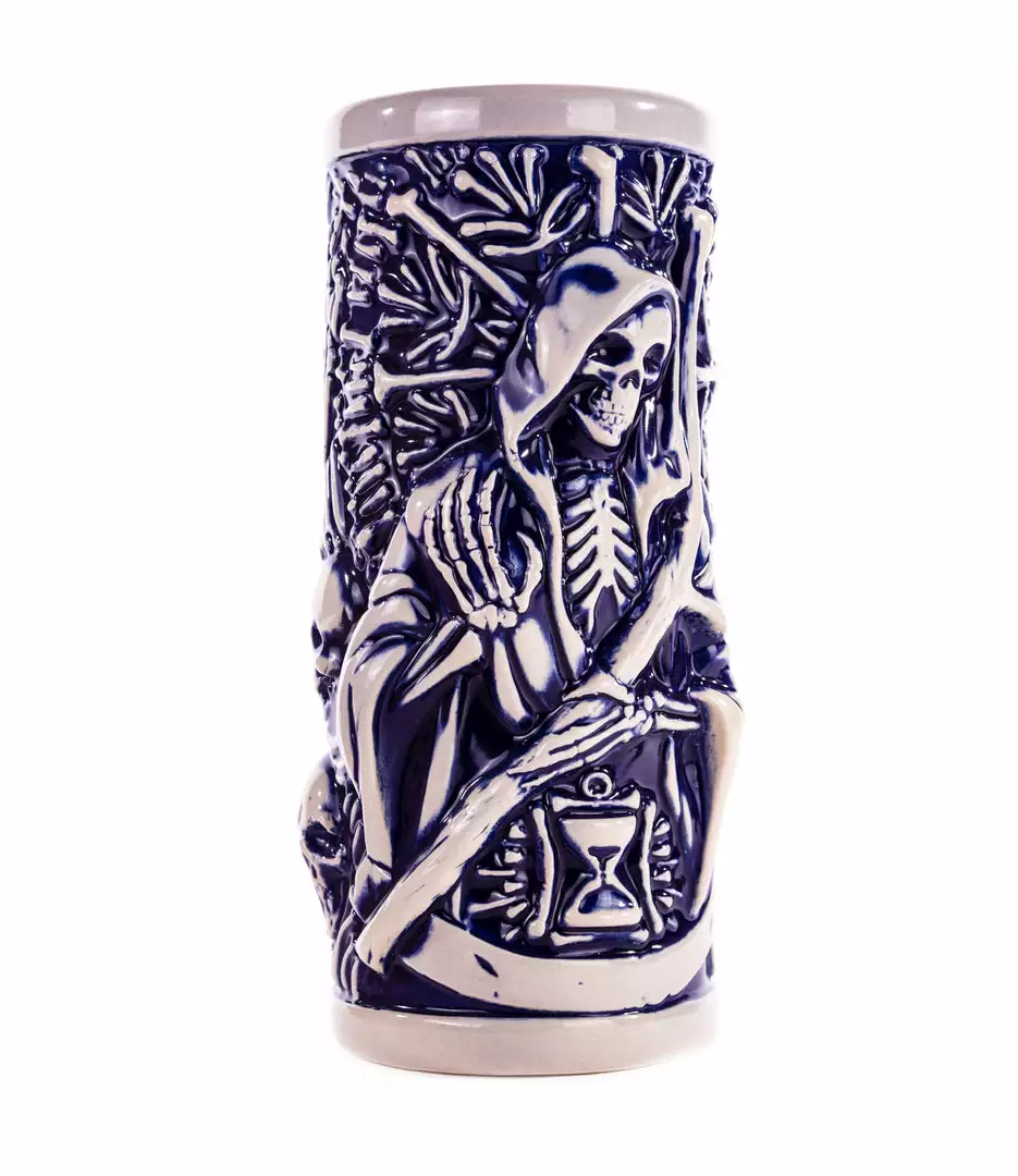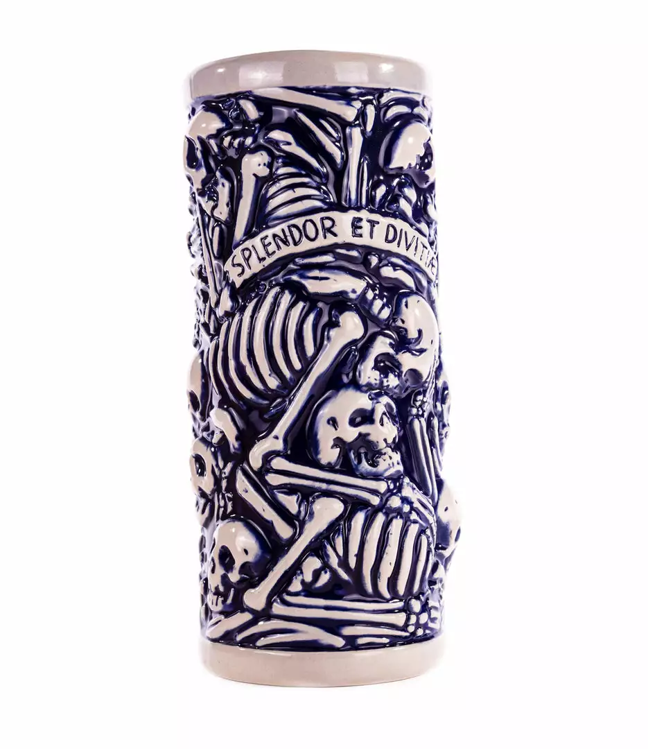 Continuing our Designer Series of tiki mugs, we asked artist Becky Cloonan to come up with a design, and our only request was “something with a Grim Reaper.” And she delivered- big time! Splendor & Riches Designer Series Tiki Mug- something like a cross between a Catholic candle and something from the Sediec Ossuary, is sculpted by Tufan Sezer & Mike Bonanno, and produced by our friends at Tiki Farm, stands approx. 7.” tall, and holds 22oz. The Mortuus version of Splendor and Riches features a white glaze base, with a blue wipe.