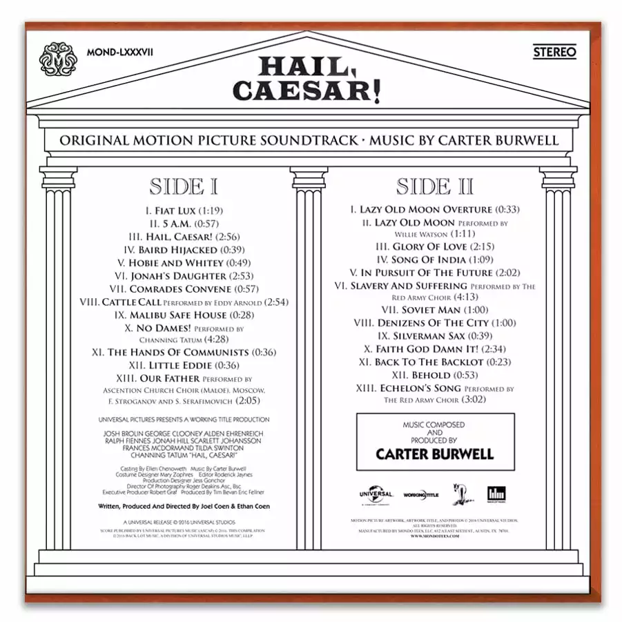 Mondo is beyond honored to present our very first Coen Brother’s soundtrack, as well as our first Carter Burwell score, the magnificent soundtrack for the Coen’s latest farce, Hail, Caesar!, which marks Burwell’s 16th collaboration with the brothers. Prior collaborations include Blood Simple, Raising Arizona, Miller’s Crossing, Barton Fink, The Hudsucker Proxy, Fargo, Intolerable Cruelty, The Ladykillers, No Country for Old Men, Burn After Reading, A Serious Man, and True Grit.