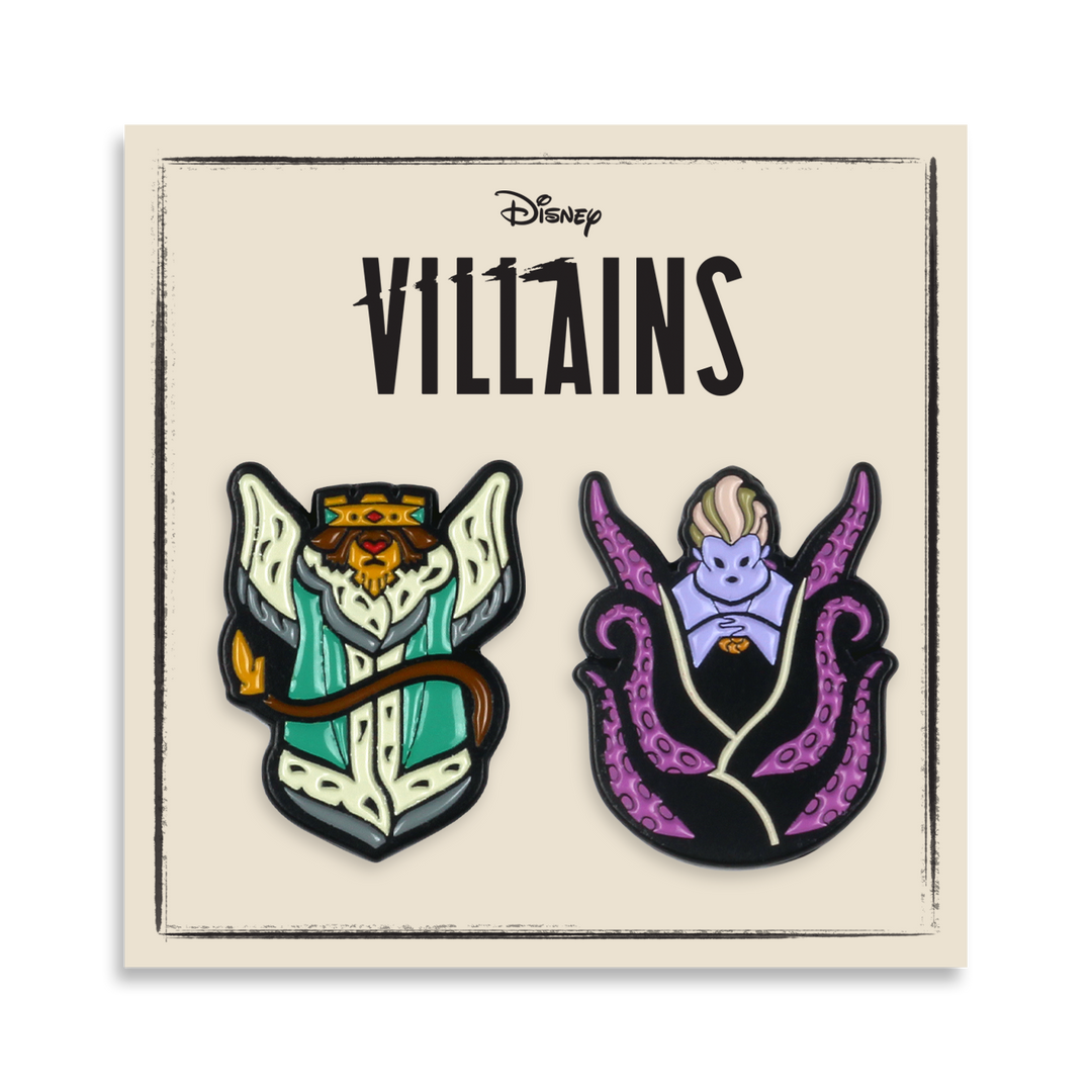 Our second series of Disney Villains enamel pins designed by the talented artist Dave Quiggle, featuring the phony king of England β Prince John of ROBIN HOOD, alongside the devious witch of the sea β Ursula of THE LITTLE MERMAID. Dave’s illustrative style carries the hand of a tattoo artist β thick bold outlines and saturated colors are the hallmark of this growing collection of neβer-do-wells.