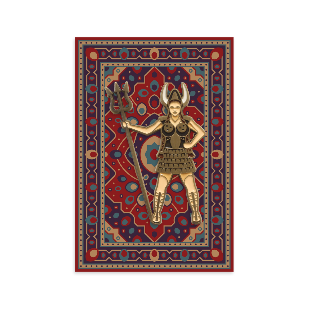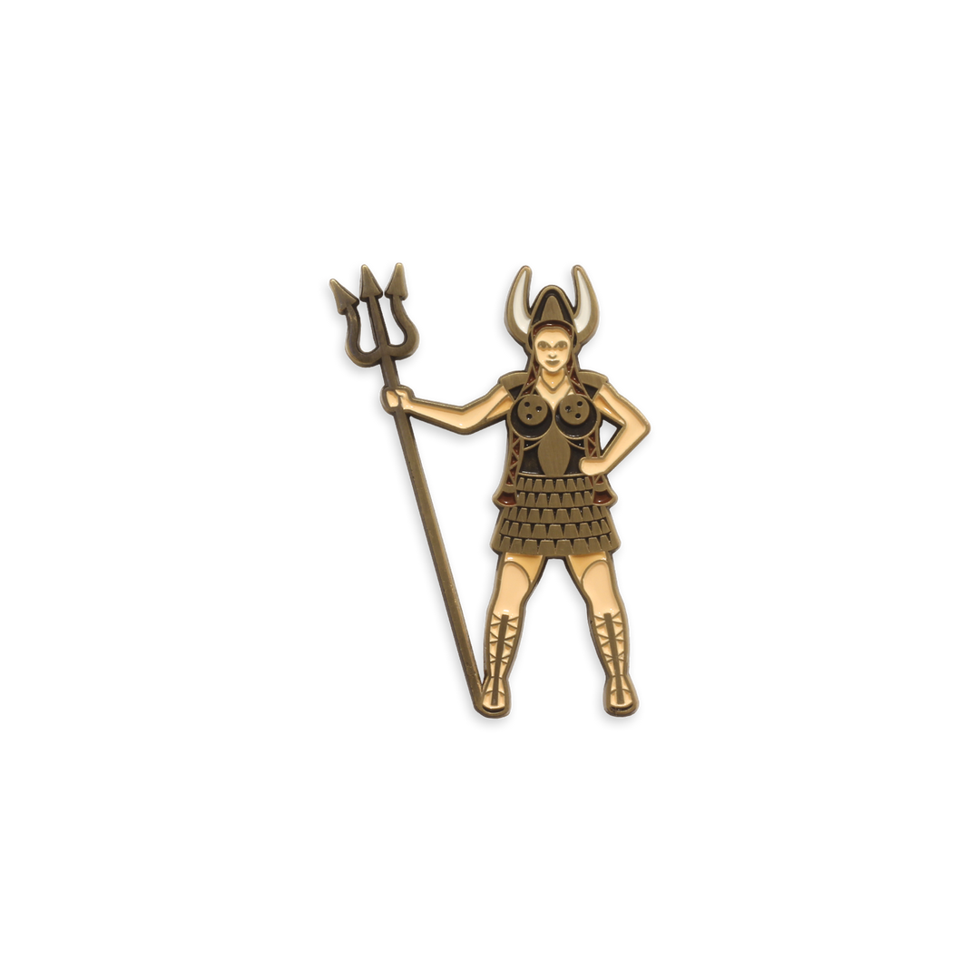 2″ high soft enamel pin, double-posted on antique gold metal with rubber clutch backings.
