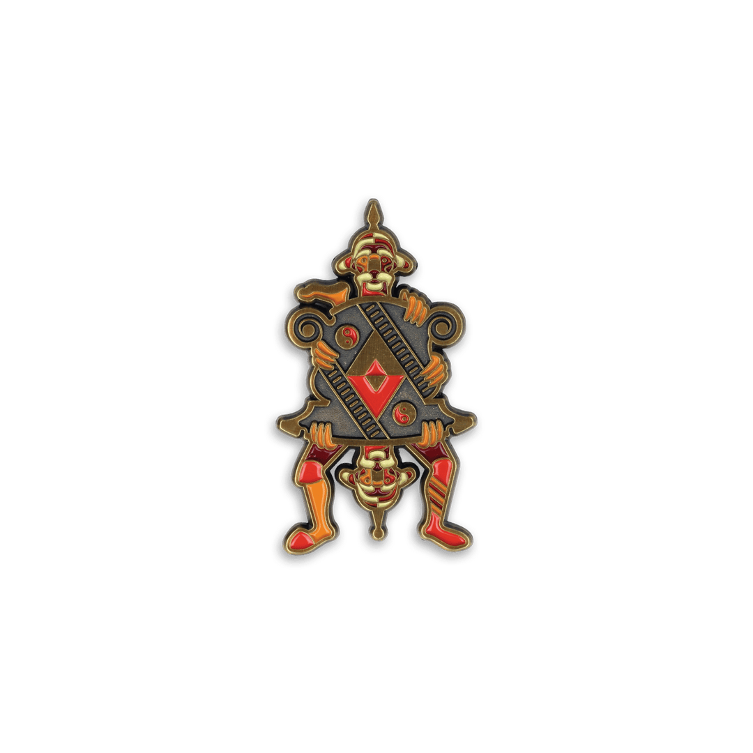 2″ high soft enamel pin, double-posted on antique gold metal with rubber clutch backings.
