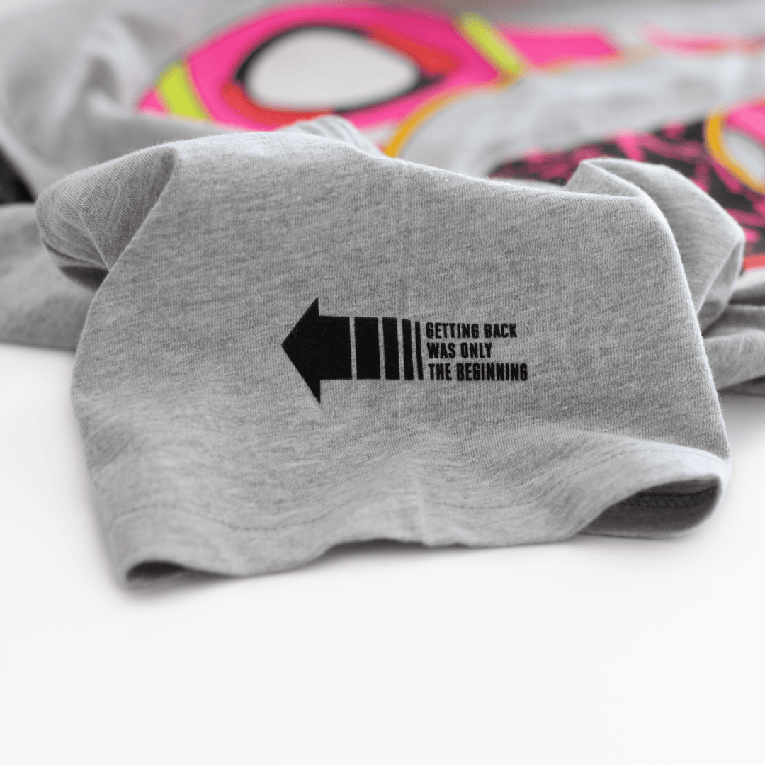 Printed by Impact Merchandising on Bella + Canvas 3001 Heathered Grey cotton tees with printed interior label.