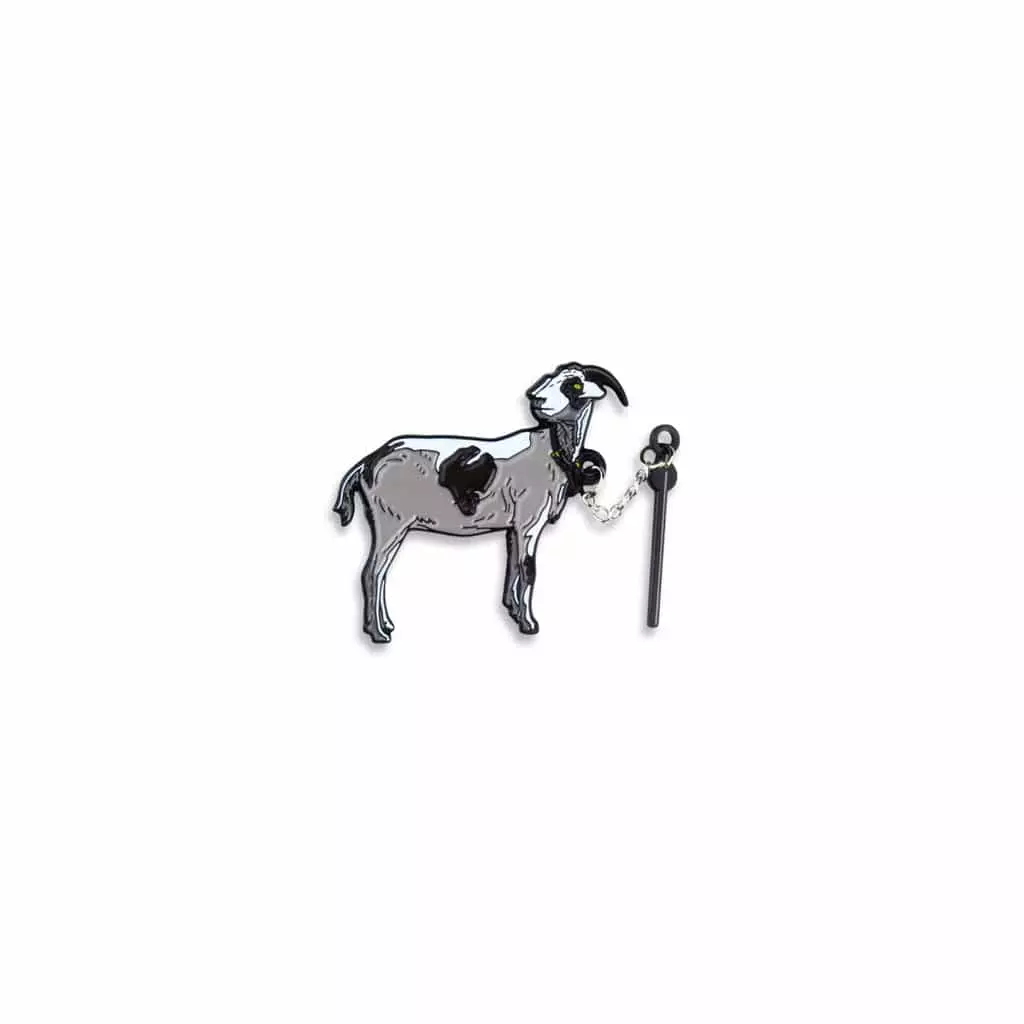 1.5″ and 1″ high soft enamel pins designed by Matthew Woodson. Double-post goat and single-post pole on black metal with rubber clutch backings, and connecting chain.
