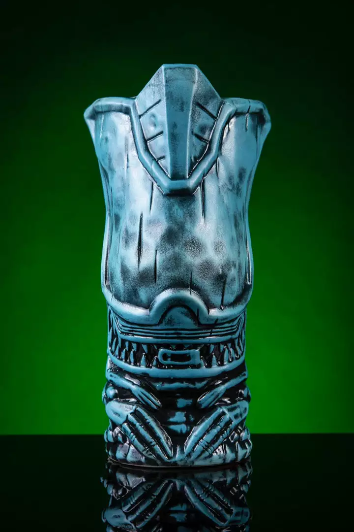 A chillyΒ blue and black Airlock VariantΒ of ourΒ Alien Queen Tiki, aΒ handmade 22-ounce ceramic mug inspired by both Tiki culture and James Cameron’s ALIENS. The set includes two swizzle sticks β aΒ Facehugger andΒ a Chestburster.