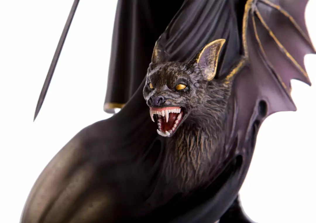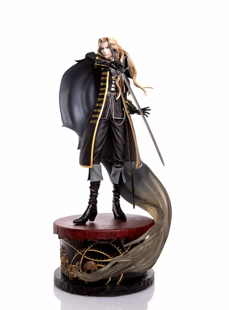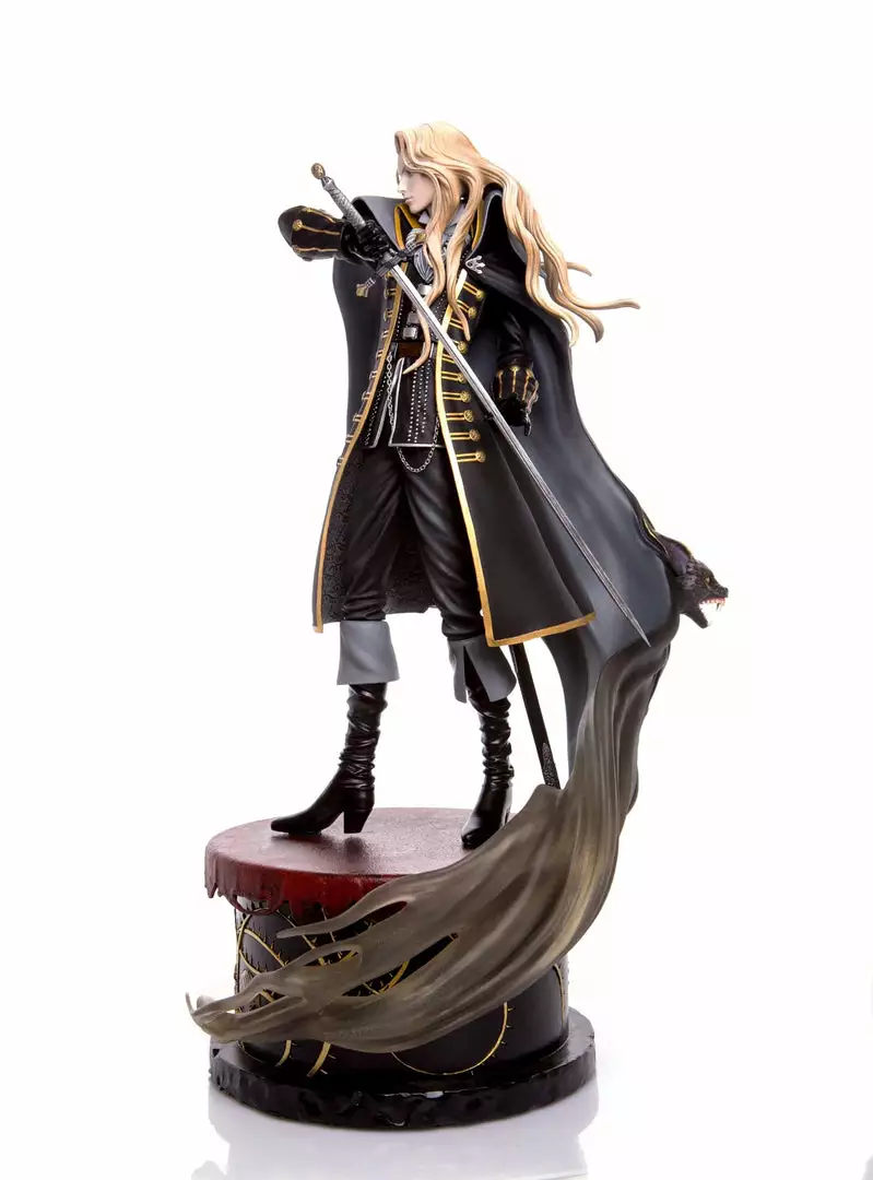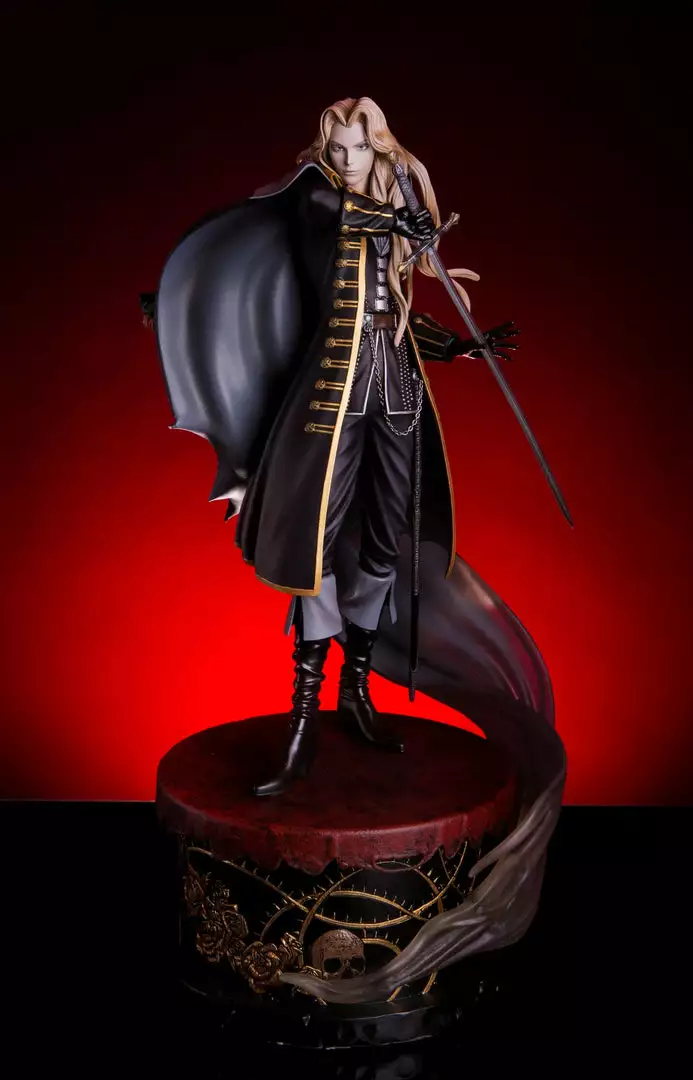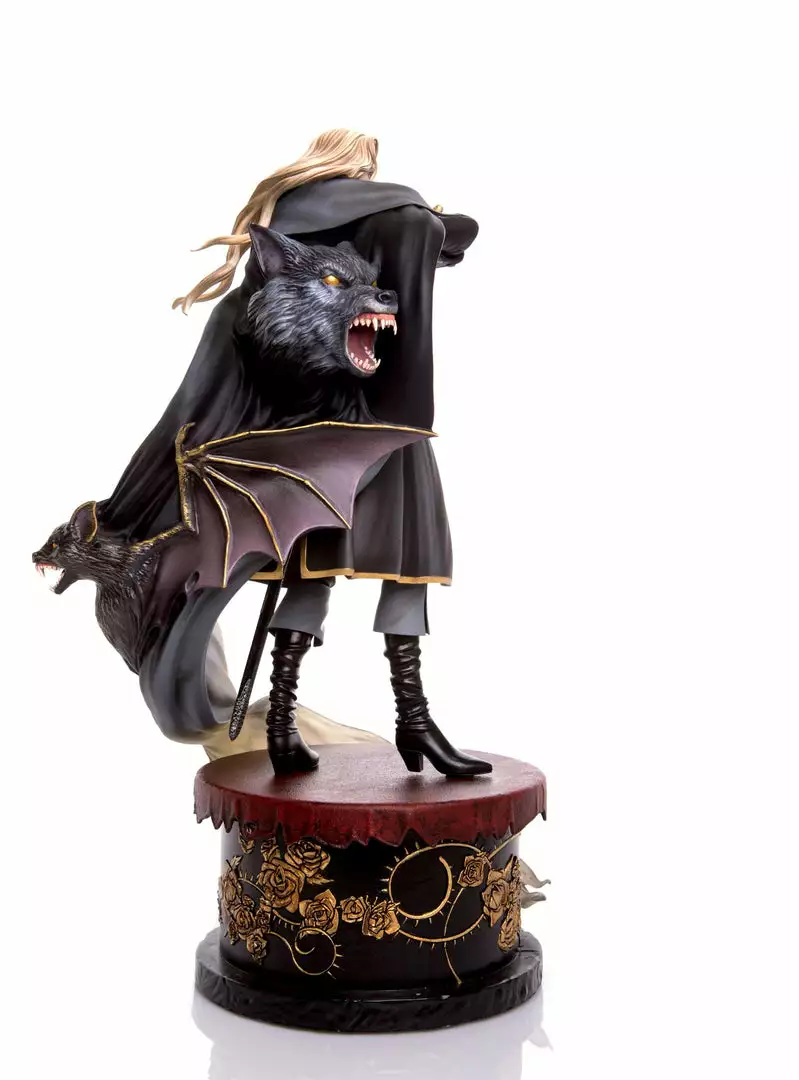 Based on the classic Konami game Castlevania: Symphony of the Night, the Alucard statue is an original design inspired by the artwork of Ayami Kojima for the game. The statue depicts the half-human, half-vampire son of Dracula as an elegant yet ready for battle swordsman, with his cape revealing his three shape-shifter forms: mist, bat, and wolf! Alucard also features a interchangeable right arm throwing a dagger, one of his sub-weapons from the game!