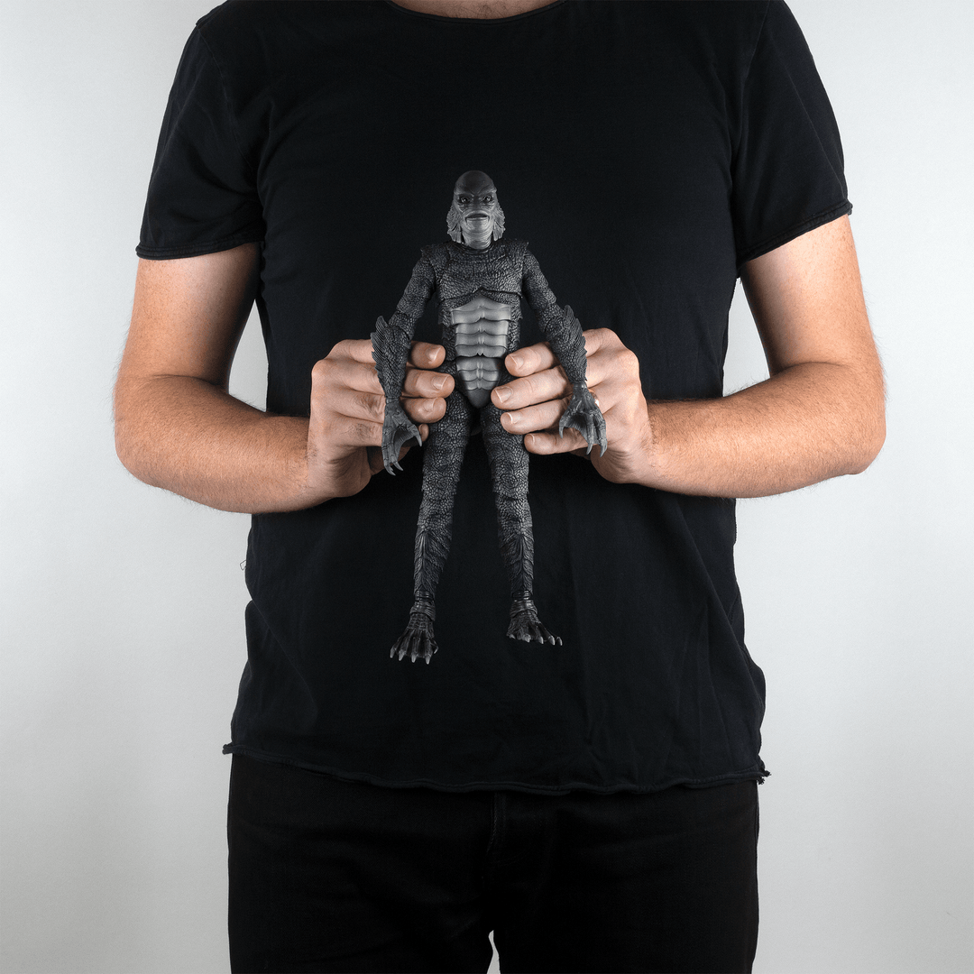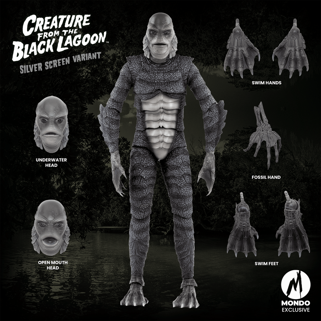 We make creature collectible history with the (we’re pretty sure) first ever CREATURE FROM THE BLACK LAGOON 1/6 Scale Figure. Meticulously crafted and two years in the making, this swamp-rompin’ figure has 16 points of articulation, stands at 12″ tall, comes with switch-out swim hands and feet, as well as two switch-out heads. Also comes with a fossil hand accessory. Available in classic Creature colors as well as a Silver Screen Variant.