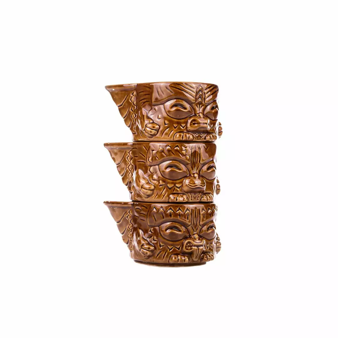 You know the rules, but can you remember to follow them? The Mogwai Tiki Stackers are 3 mini mugs that can be stacked into one tiki totem! Each mini mug holds approx. 8oz, and represents a different Mogawi with a rule-rune on the back- Gizmo with water, Stripe with bright light, and Hungry Mogwai with feeding after midnight! Designed by Michael Bonanno, sculpted by Tom “Thor” Thordarson, and produced with the gremlins at Tiki Farm, The Mogwai Tiki Stackers will remind you that some rules shouldn’t be broken, but can be fun if they are!