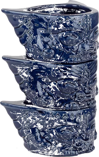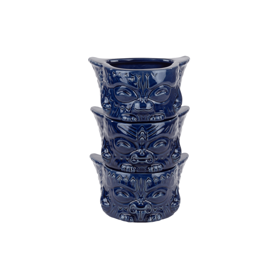 One of our most popular tiki releases, the Mogwai Tiki Mug Stackers are 3 mini-mugs that can be stacked into one tiki totem, and we’re pleased to release our latest limited Variant Edition: Midnight Blue. Each mini-mug holds approx. 8oz, and represents a different Mogwai with a rule-rune on the back: Gizmo with water, Stripe with bright light, and Hungry Mogwai with feeding after 12 AM. Designed by Michael Bonanno, sculpted by Tom “Thor” Thordarson, and produced with the gremlins at Tiki Farm, The Mogwai Tiki Mug Stackers will remind you that rules are made to be broken. Especially where tiny squeezable psychopaths are concerned.