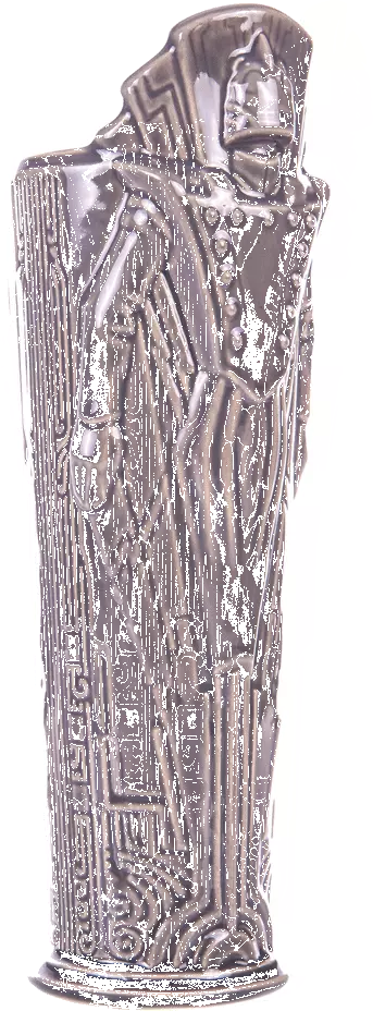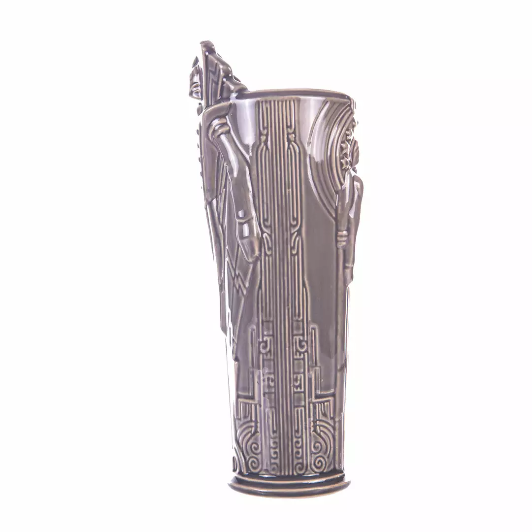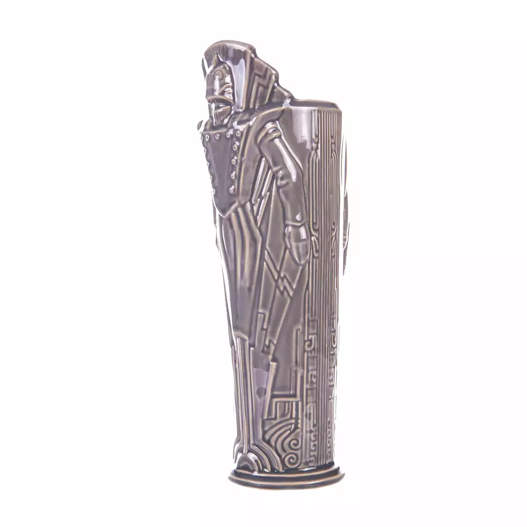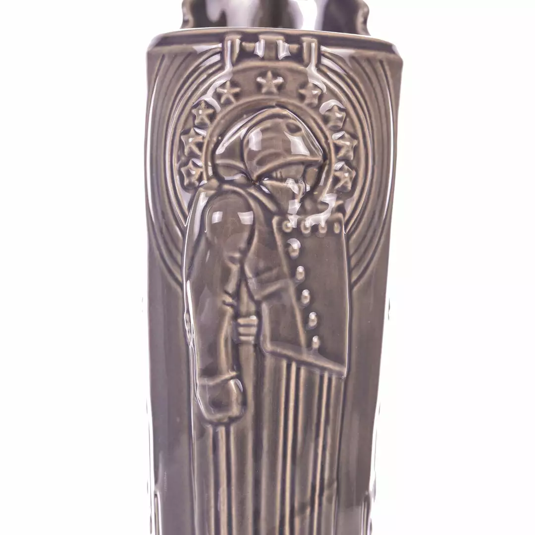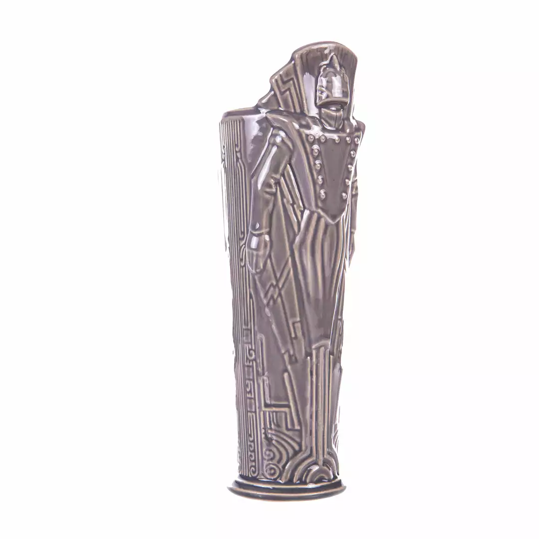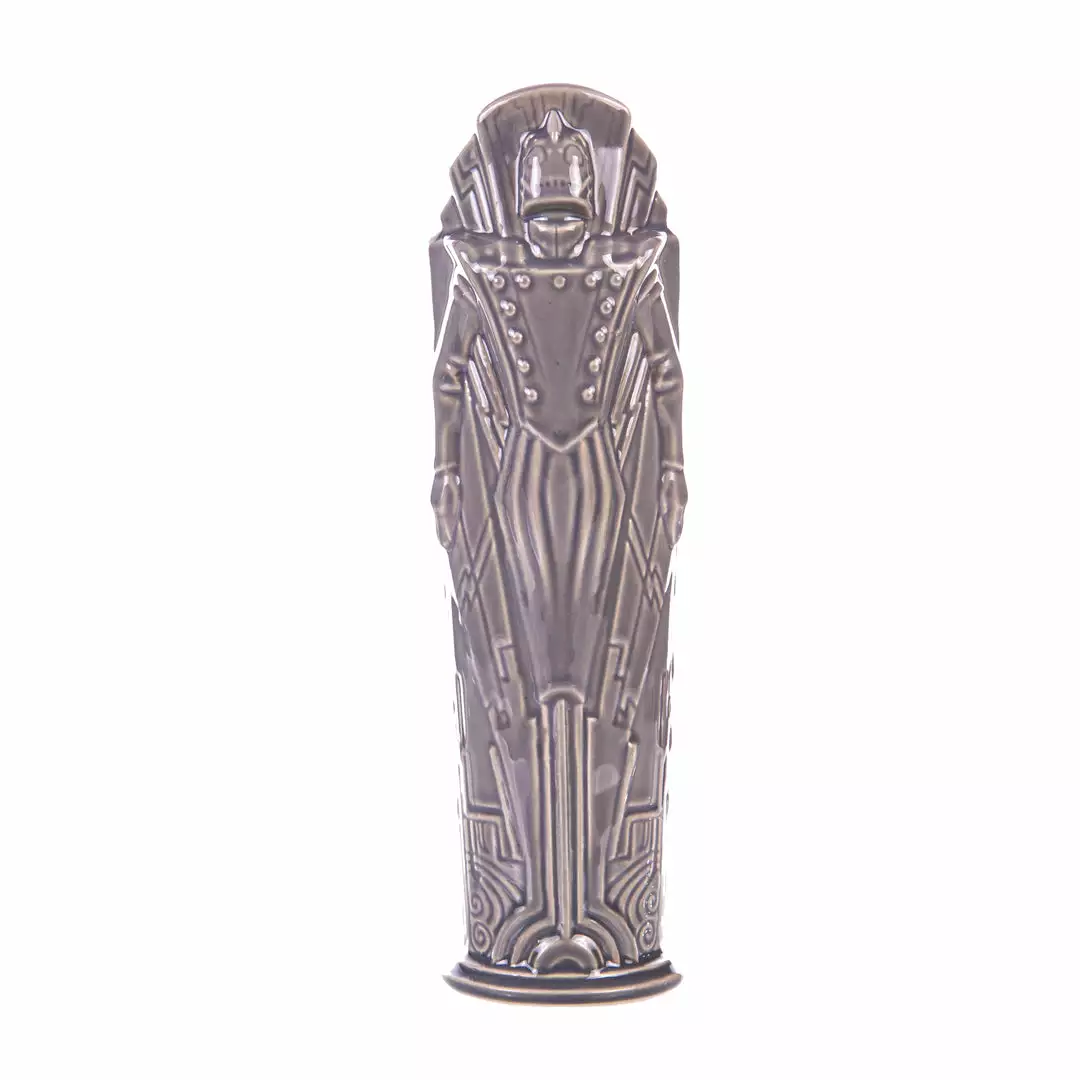 One of the greatest cinematic superhero epics of the 20th century is reborn as a stratospheric tiki mug. Created as an independent comic book by cartoonist Dave Stevens, The Rocketeer is a fictional fighter for the ages, patrolling the skies of 1940s Hollywood to keep America safe from hoodlums and madmen. This tiki treatment of the golden-domed hero was created by artists Eric Siebenaler and Brian Oskins, and no two-fisted vigilante’s drinkware collection is complete without it. NOTE: These mugs are handmade, making each one unique, so slight variations from images shown may occur.