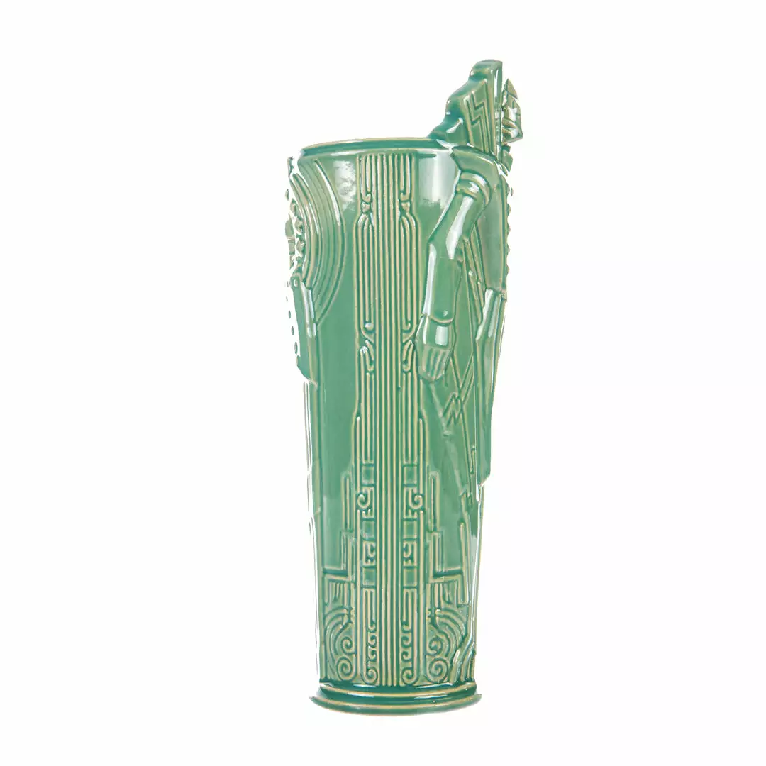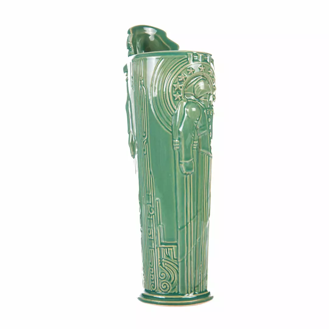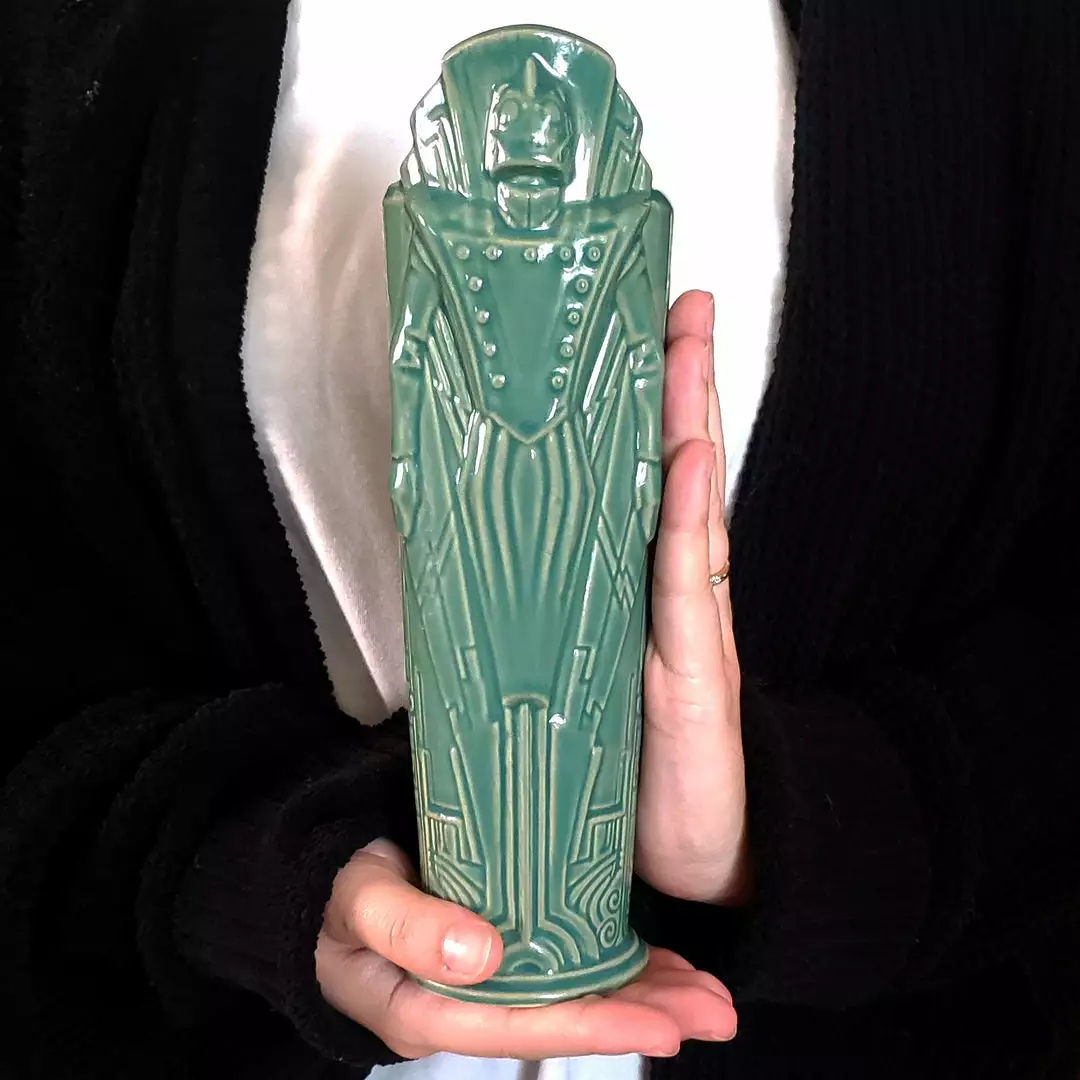 One of the greatest cinematic superhero epics of the 20th century is reborn as a stratospheric tiki mug. Created as an independent comic book by cartoonist Dave Stevens, The Rocketeer is a fictional fighter for the ages, patrolling the skies of 1940s Hollywood to keep America safe from hoodlums and madmen. This tiki treatment of the golden-domed hero was created by artists Eric Siebenaler and Brian Oskins, and no two-fisted vigilante’s drinkware collection is complete without it.