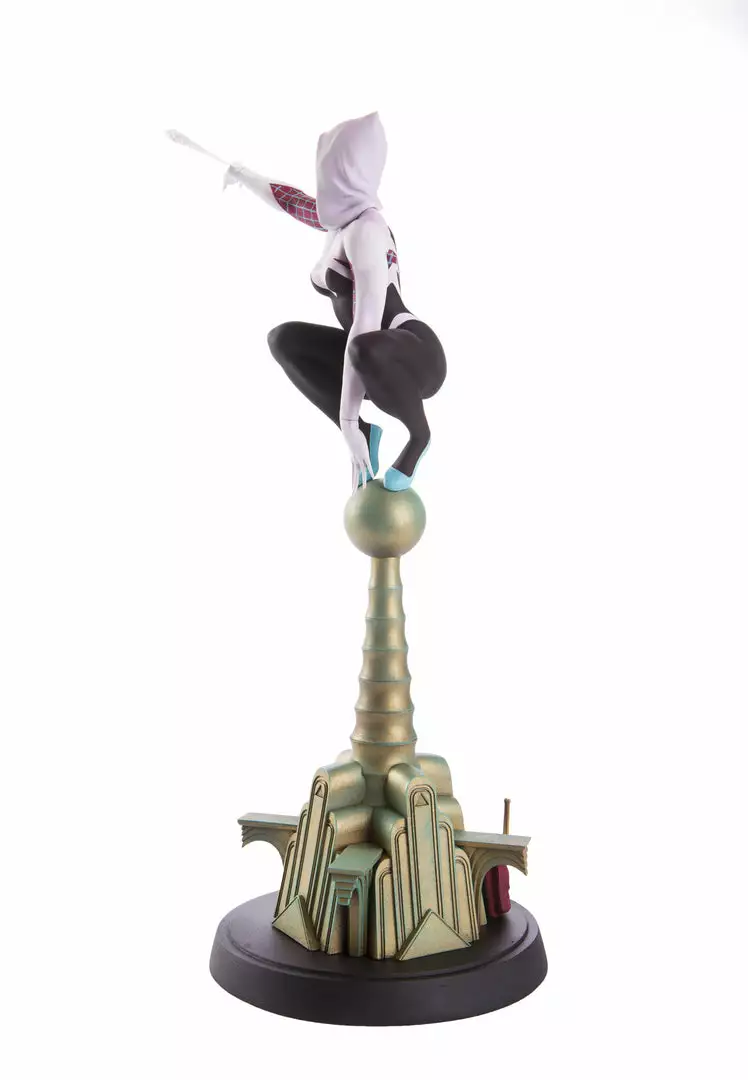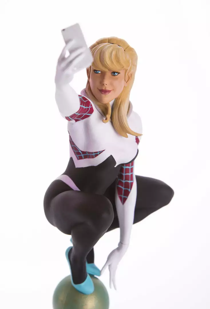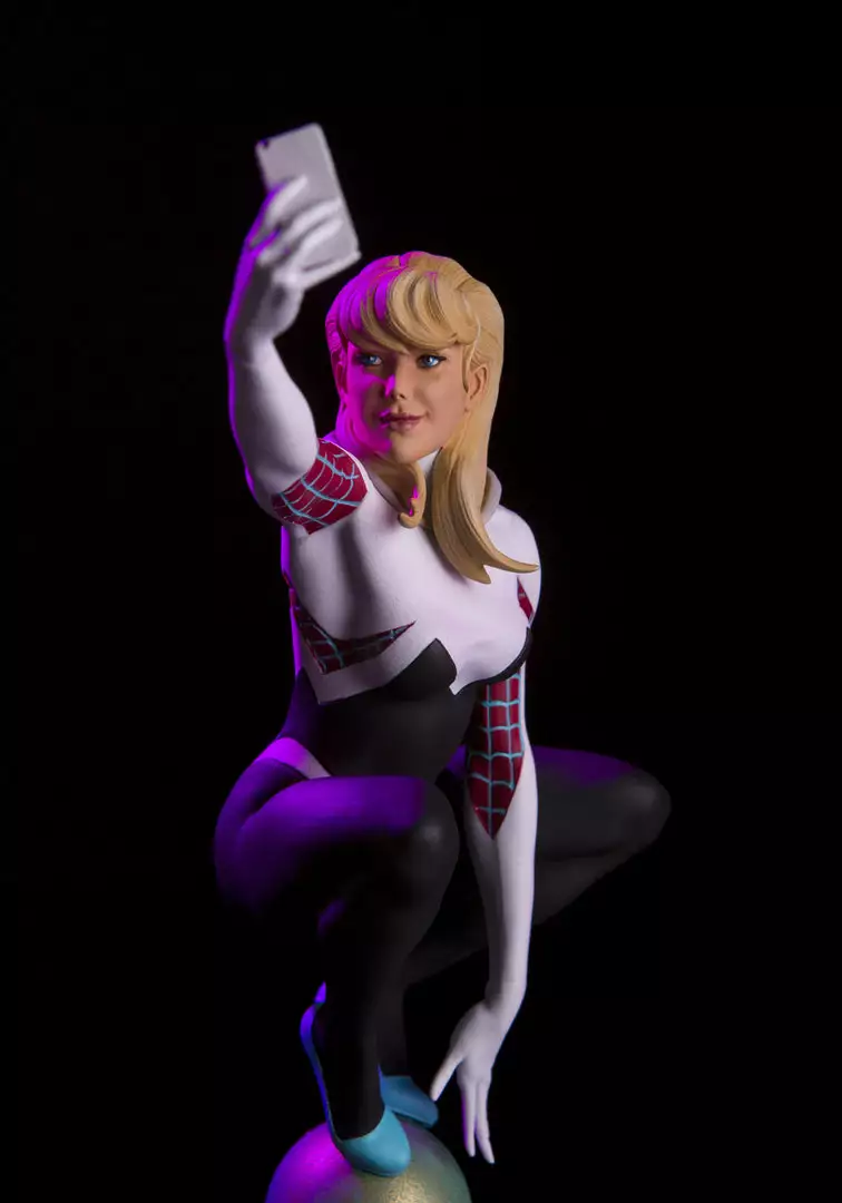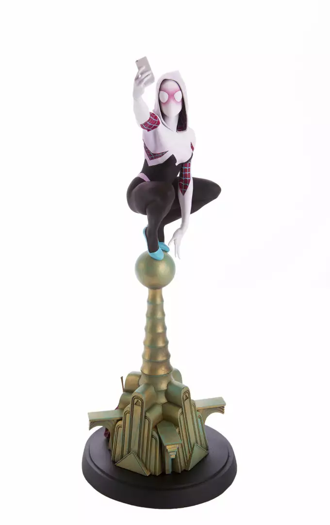 Based on Phantom City Creative’s gorgeous art print, this statue shows Spider-Gwen (aka Spider-Woman, aka Gwen Stacy) either spending a quiet moment perched atop a high-rise building, taking a selfie after a day of being a hero OR slinging a web to swing into action! It’s your choice, as she comes with interchangeable web-shooting and selfie hands!