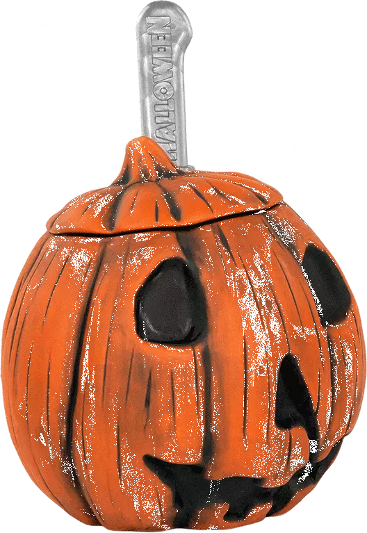 From the slasher classic Halloween comes our tiki mug, inspired by the jack-o-lantern from the opening credits, and featuring a “carved” Michael Myers on the back. Complete with removable pumpkin lid, THREE Slasher Swizzle Sticks and holds approx 17oz.Β Designed by: Mike Bonanno, Sculpted by: Tufan Sezer and Kristin Rousseau and Manufactured by Tiki Farm.
