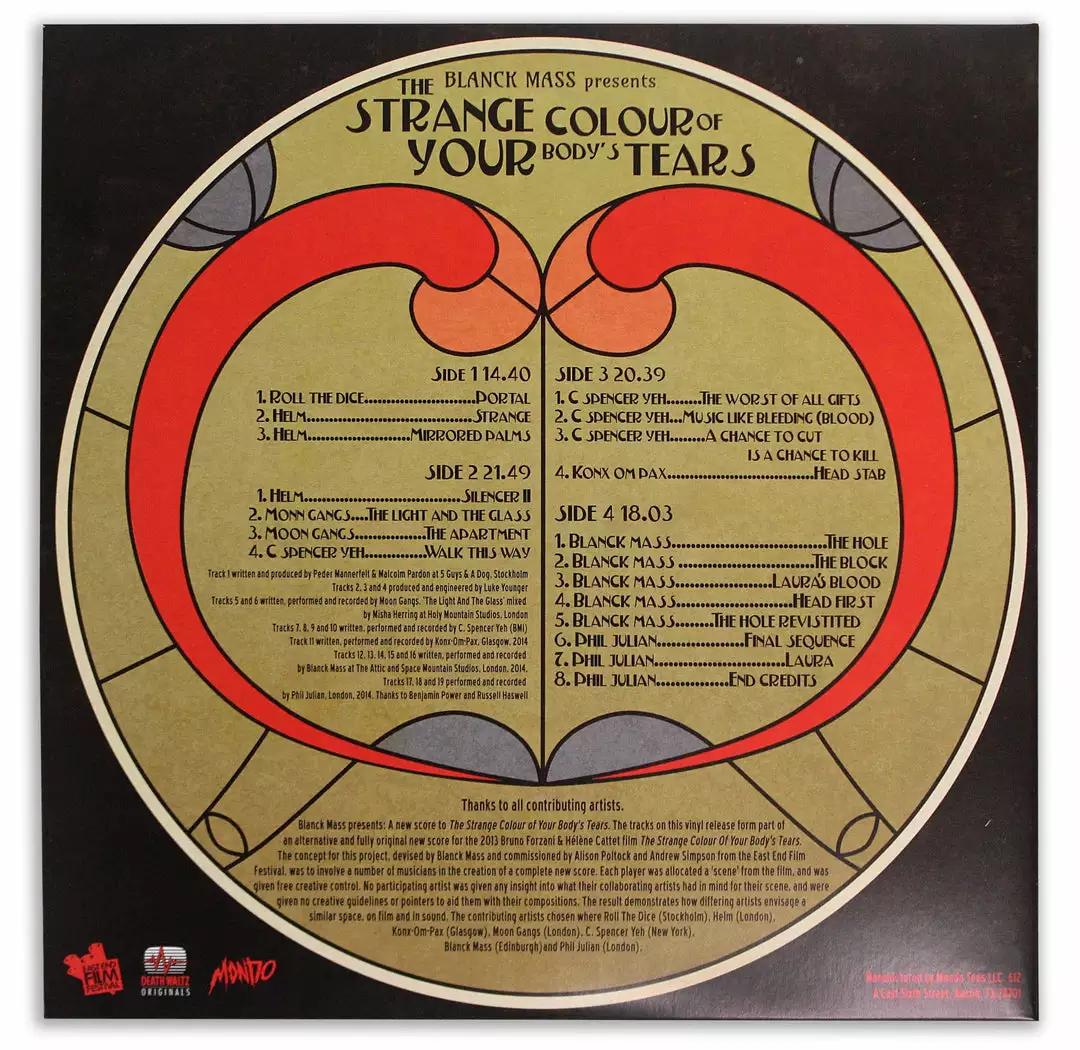 Death Waltz Originals are proud to present a spectacular new record curated by Blanck Mass & commissioned exclusively by the East End Film Festival, an alternative score to the 2013 film THE STRANGE COLOUR OF YOUR BODY’S TEARS, directed by Bruno Forzani and Héléne Catet. A full-on homage to the Italian giallo films from Mario Bava and Dario Argento, the original release had no original score and instead used music from existing giallo films. Edinburgh musician Ben Power (Blanck Mass, Fuck Buttons) devised to use this as a stage for experimentation and collaboration with several artists from across the globe.