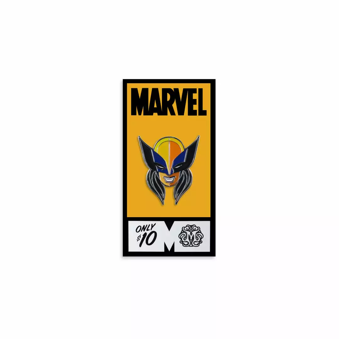 Soft enamel X-23 pin designed by Tom Whalen inspired by her comic appearances. Approximately 1.25″ high, shiny silver nickel, with a single post and butterfly clutch backing. Comes affixed to heavy card stock Marvel packaging.