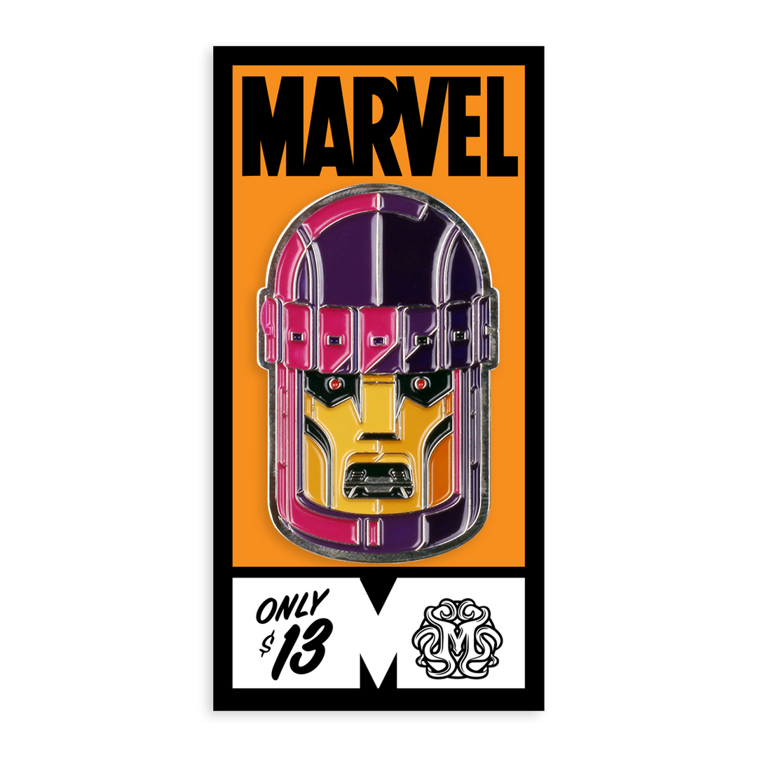 Marvel Comicsβ Sentinel designed by Tom Whalen. 2″ high soft enamel pin on shiny silver nickel, double-posted with butterfly clutch backings.